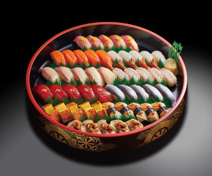 熟成金目鯛(柚子のせ)・サーモン・イカ・ハマチ・生エビ・づけマグロ・こはだ・江戸前玉子・あなご・煮はまぐり